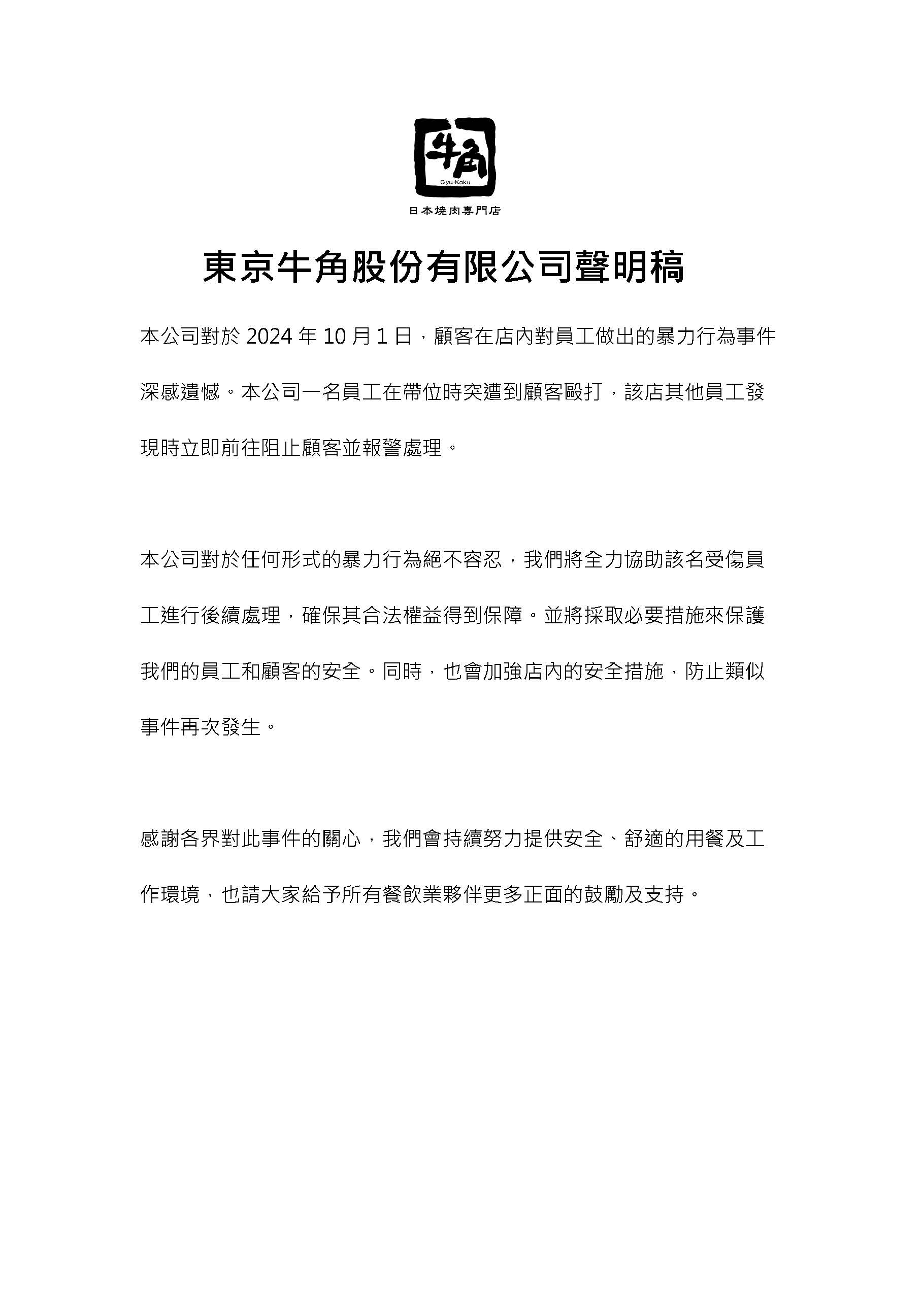 【本公司 台中Lalaport店 顧客暴力事件聲明稿】
