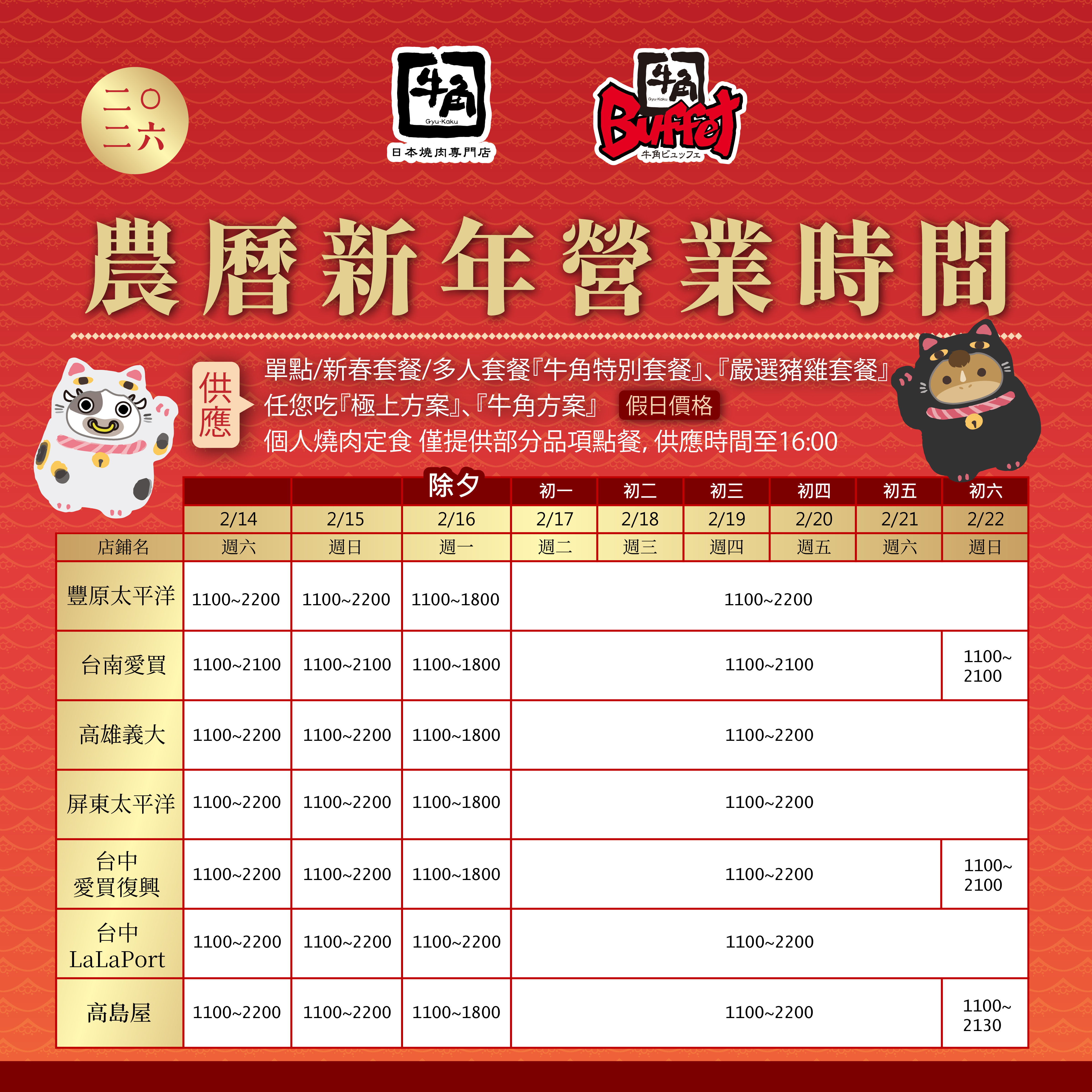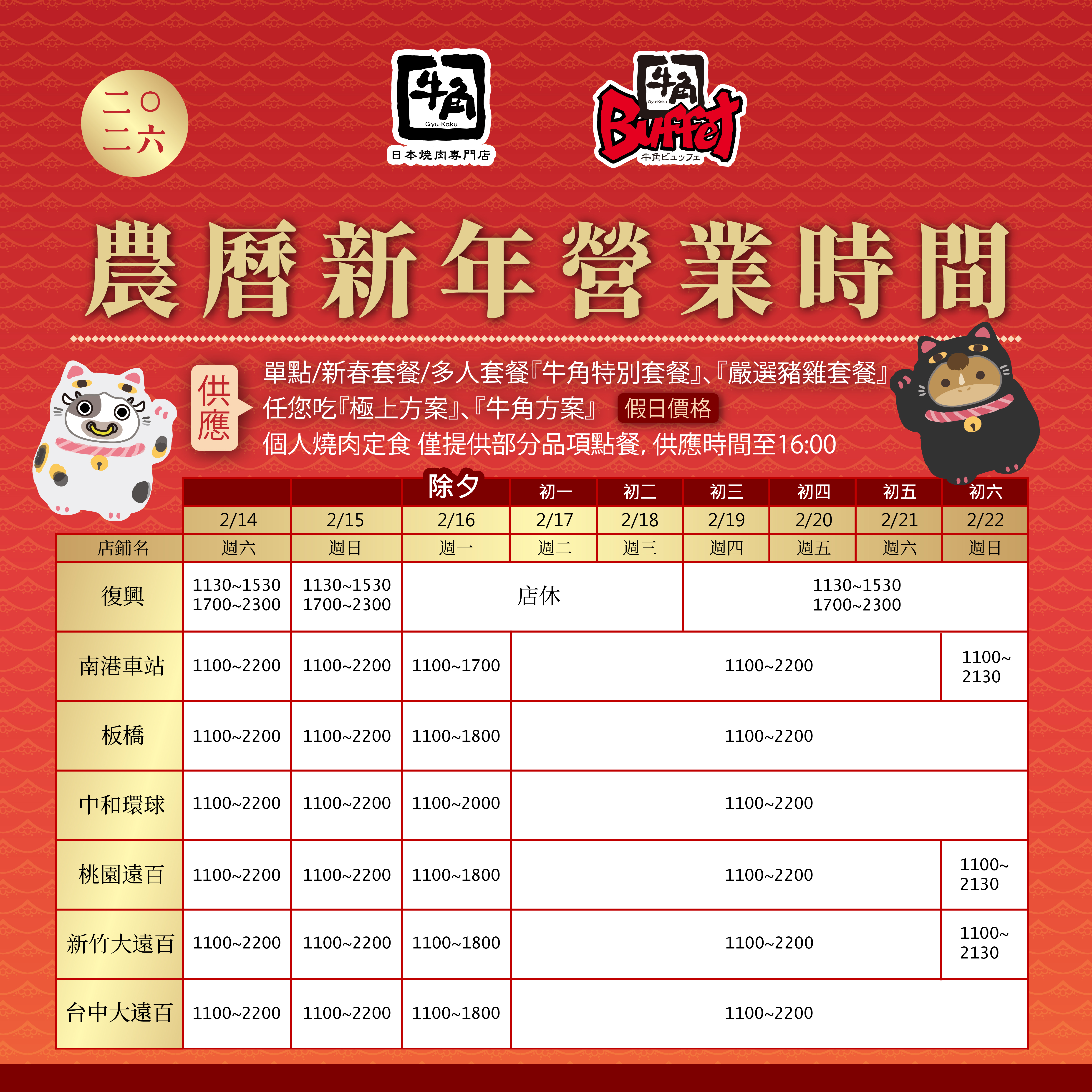 2026年 春節期間營業時間公告(牛角燒肉/牛角Buffet)